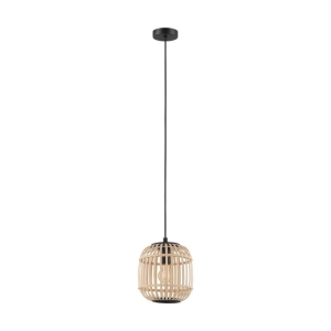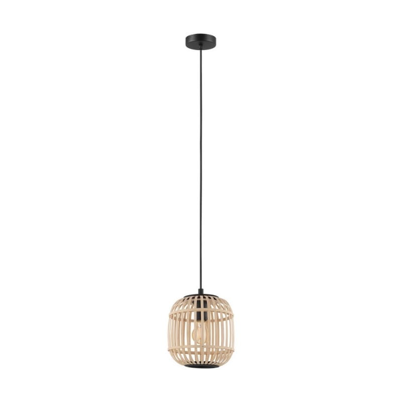 Lampa wisząca BORDESLEY, rustykalna, loft, boho. Lampa posiada klosz wykonany z naturalnego drewna bambusowego i okrągłe, czarne metalowe zawieszenie. Po włączeniu klosz tworzy fascynującą grę światła i cienia. Lampa wisząca płynnie wpisuje się w „tendencję natury” i tworzy przyjemną atmosferę dzięki naturalnym materiałom. Oferuje specjalne oświetlenie do każdego pomieszczenia - czy to w salonie, czy w jadalni nad stołem jadalnym. Przedstawiona żarówka nie jest objęta zakresem dostawy. Lampa nadaje się do każdego źródła światła z trzonkiem E27.