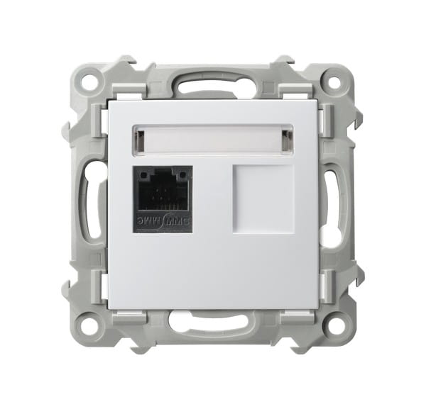 Gniazdo komputerowe (RJ45) podwójne przeznaczone do podłączenia dwóch kabli sygnałowych kategorii 5e (UTP) typu skrętka (internet). Do kompletu wymagana ramka. Można stosować do systemów ramkowych wielokrotnych.