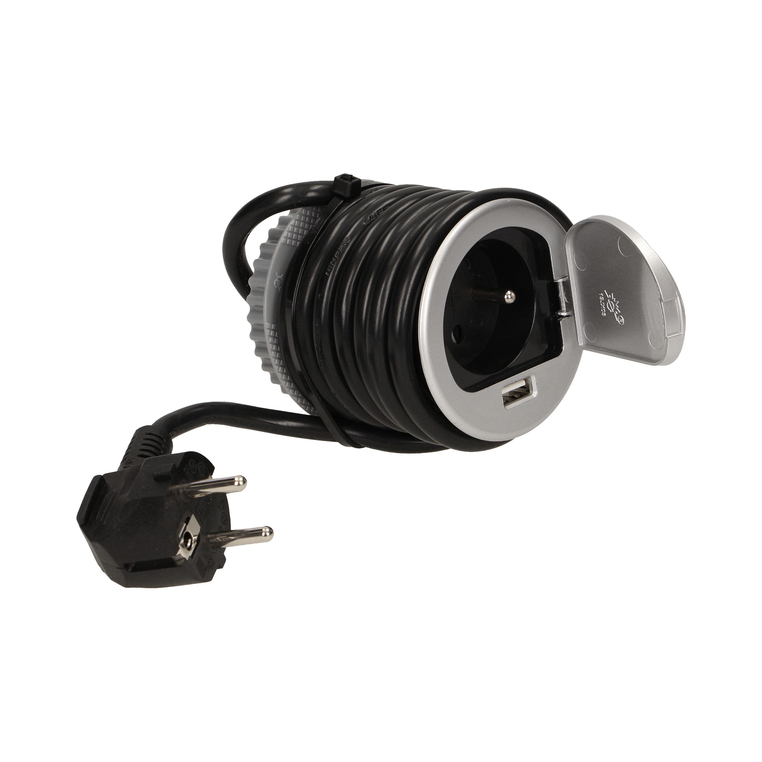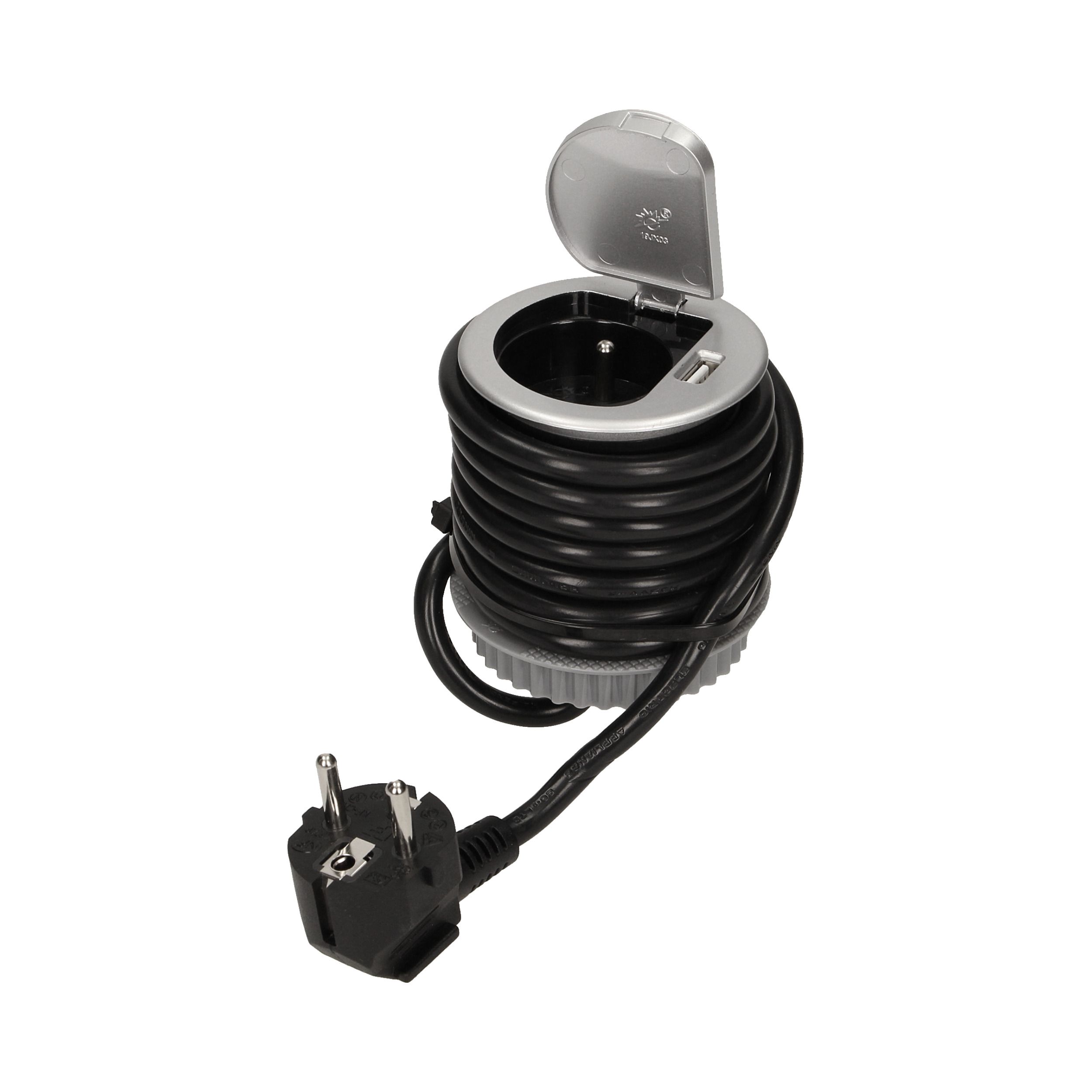 Gniazdo meblowe Ø6cm wpuszczane w blat z pokrywką, ładowarką USB i przewodem 1,8m, 1x2P+Z, 1xUSB ORNO