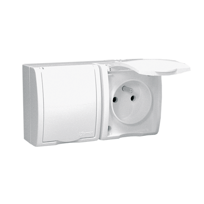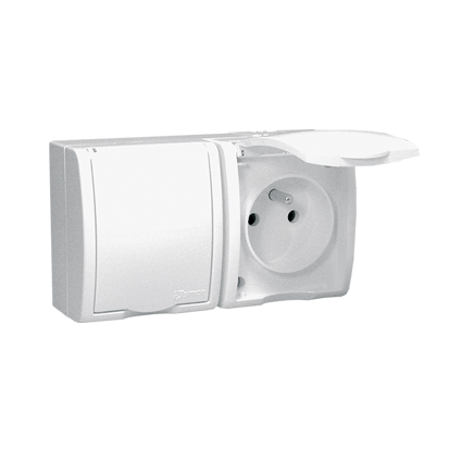 Gniazdo hermetyczne IP54 z klapką, przeznaczone do montażu w miejscach o podwyższonej wilgotności, takich jak łazienka.