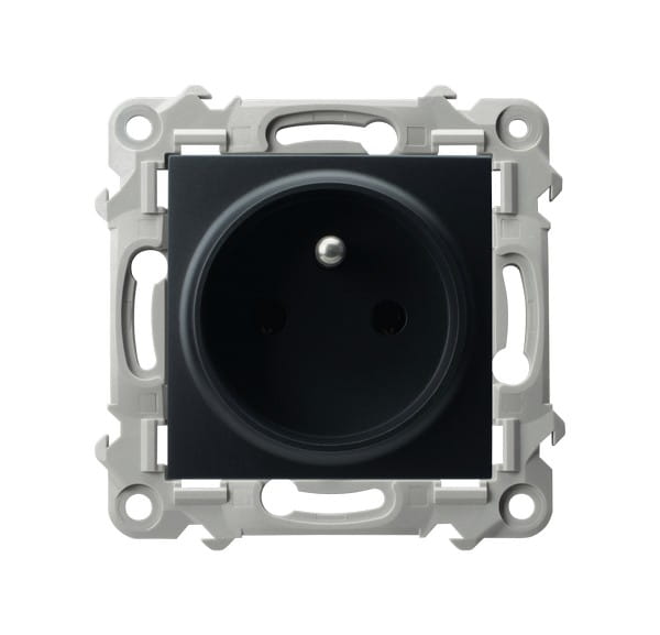Standardowe gniazdo elektryczne pojedyncze z bolcem uziemiającym. Do kompletu wymagana ramka. Można stosować do systemów ramkowych wielokrotnych.