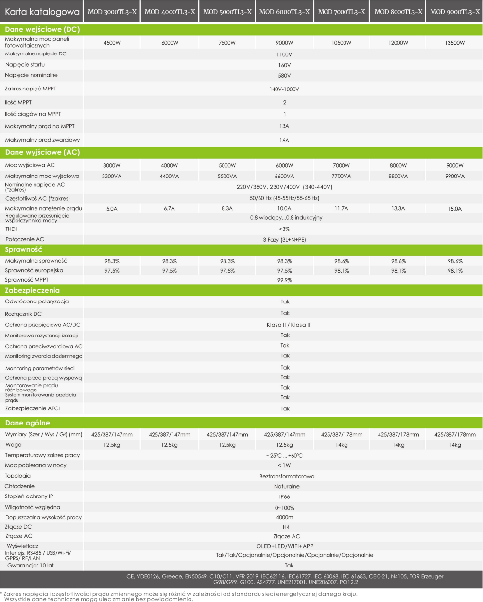 Chłodzenie naturalne, bez zastosowania wentylatorów, ogranicza hałas i elementy narażone na zużycie. Falownik waży 12,5 kg i ma kompaktowe wymiary, co ułatwia montaż. Po stronie AC i DC zastosowano komplet zabezpieczeń, w tym ochronę przepięciową typu II, monitoring rezystancji izolacji, zabezpieczenie przed odwrotną polaryzacją oraz zabezpieczenie AFCI, wykrywające łuk elektryczny w obwodach DC.