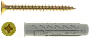 Zestaw mocujący marki BENOX, składający się z 100 sztuk kołków czterodzielnych typu BX10 oraz wkrętów stożkowych US5X80. Idealny do montażu w materiałach budowlanych, takich jak beton, cegła czy pustak, zapewniając pewne i trwałe mocowanie.