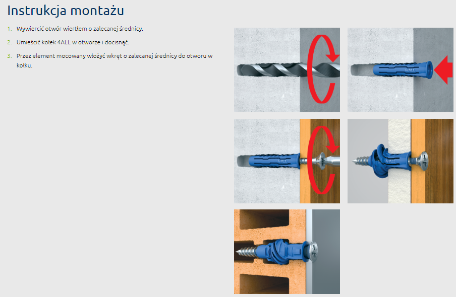 - Skrzydełka antyrotacyjne wzmacniają przyczepność kołka w szerokim zakresie podłoży, w tym w miękkich podłożach murowych i w płycie gipsowo-kartonowej.