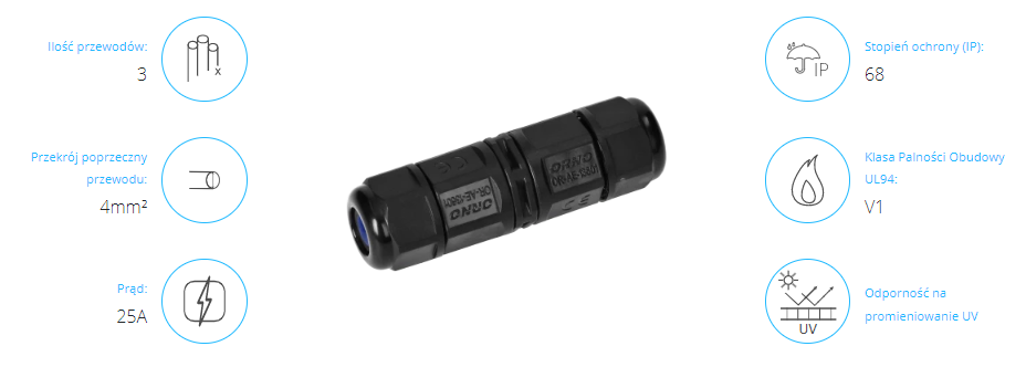 MINI konektor kablowy, o prostym kształcie i bardzo małych rozmiarach. Wysoki stopień szczelności IP68 zabezpiecza przed działaniem czynników zewnętrznych, a nowatorskie uszczelnienie O-Ringiem nie naraża uszczelnienia na niszczące warunki zewnętrzne,chemiczne i mechaniczne. Materiał użyty do produkcji konektora jest odporny na działanie promieni UV i nadaje się do stosowania na zewnątrz. Sztywna i zbita konstrukcja, oraz nowatorskie uszczelnienie, umożliwia montaż w gruncie . Styki zostały wykonane z mosiądzu, dodatkowo zabezpieczonego przed utlenianiem warstwą niklu. Dławica wyposażona została w grubą uszczelkę, która dokładnie uszczelnia wprowadzone przewody.