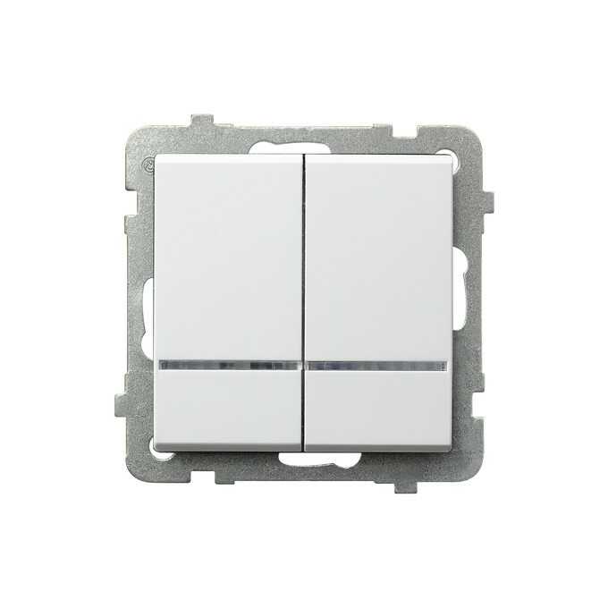 Łącznik podwójny świecznikowy z podświetleniem SONATA w kolorze białym (model ŁP-2RS/M/00) to produkt firmy Ospel, który umożliwia kontrolowanie dwóch niezależnych obwodów oświetleniowych z jednego punktu.
