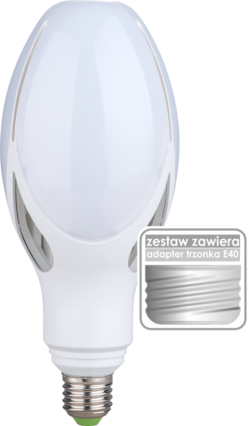 Model wyposażono w uniwersalne mocowanie E27/E40, co pozwala na łatwy montaż zarówno w standardowych, jak i bardziej rozbudowanych oprawach. Lampa pracuje na standardowym napięciu 230 V, co czyni ją gotową do instalacji w typowych systemach elektrycznych bez dodatkowych przekształtników.