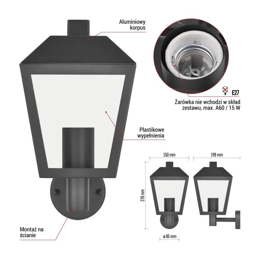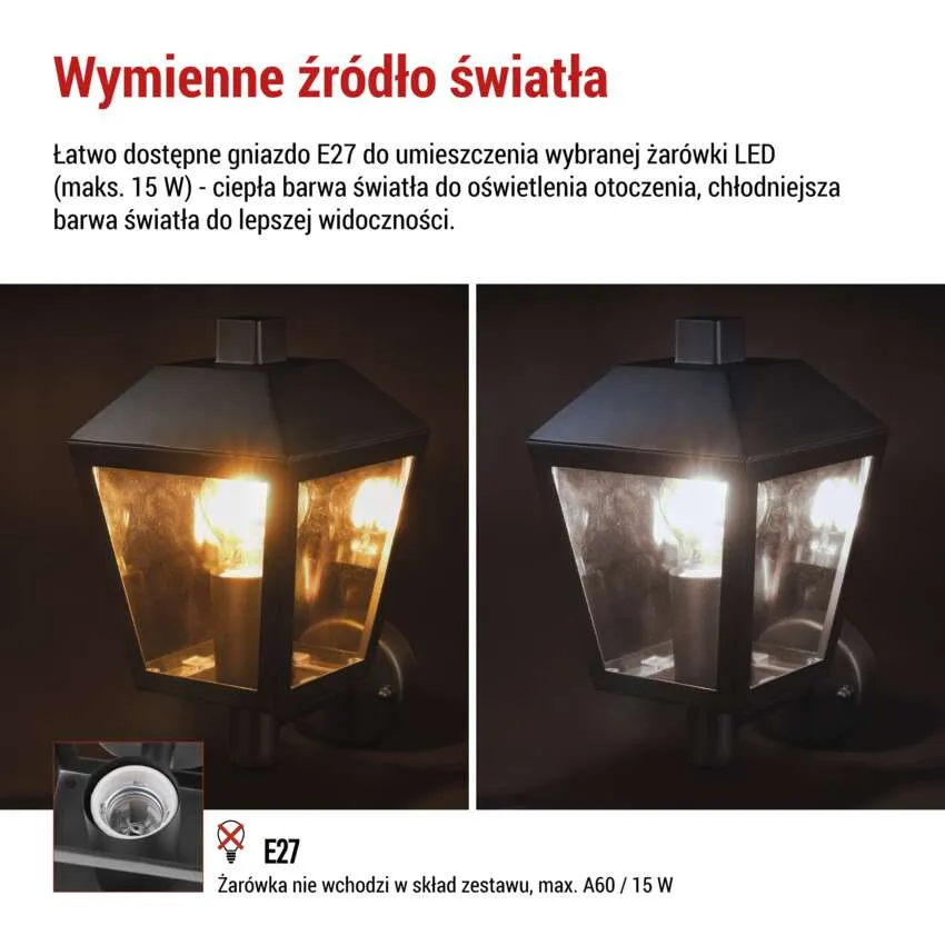Dobierz żarówkę E27 (np. LED) o mocy nieprzekraczającej 15 W. Żarówka nie jest częścią opakowania.
