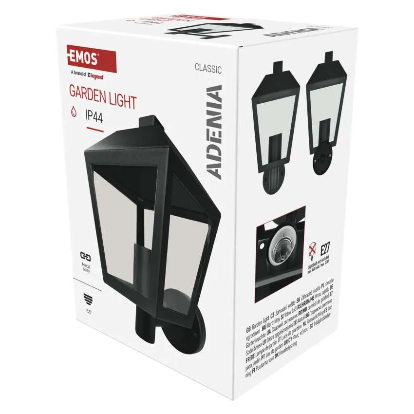 Elegancka lampa naścienna zewnętrzna marki EMOS, model Garden ADENIA 28 cm (symbol ZGB010P). Montowana naściennie, na żarówkę z mocowaniem E27 (maks. 15 W), o stopniu ochrony IP44 — idealna do elewacji budynku, tarasu lub ogrodu.