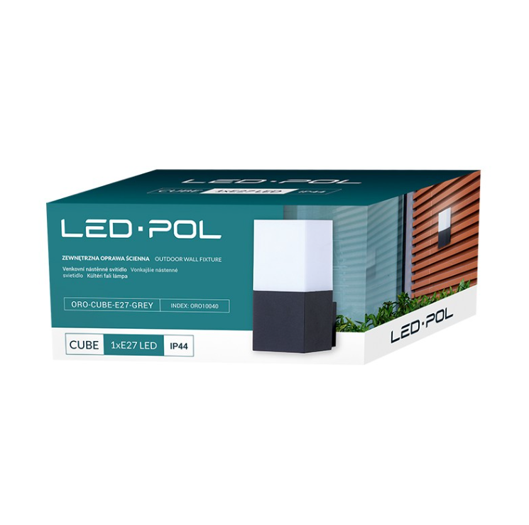 Lampa ogrodowa ORO-CUBE-E27-GREY marki LED-POL to nowoczesna oprawa przeznaczona do montażu na zewnątrz budynków. Wyposażona w popularny gwint E27, umożliwia zastosowanie wymiennej żarówki LED o mocy do 10 W. Obudowa w kolorze szarym oraz klasa szczelności IP44 zapewniają odporność na warunki atmosferyczne i estetyczny wygląd na elewacji, tarasie lub w ogrodzie.