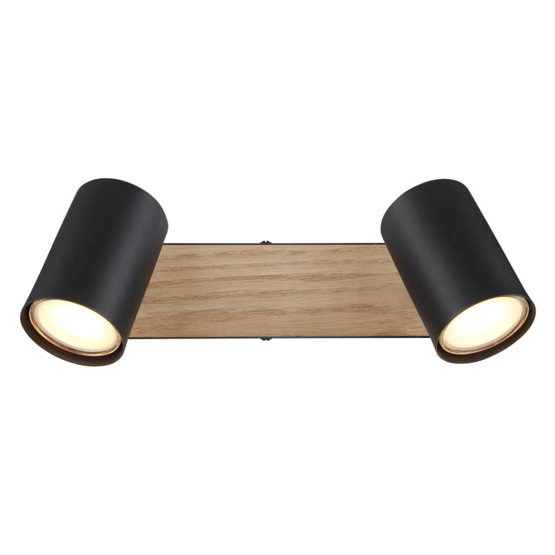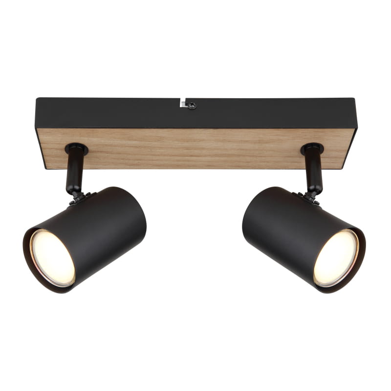Ten prosty reflektor sufitowy z serii Robby inspiruje swoim designem i kolorystyką. Dwa regulowane reflektory z gniazdem GU10, osłonięte cylindrycznym kloszem, są zamontowane na prostokątnej podstawie sufitowej z czarnego, matowego metalu i płyty MDF o wyglądzie drewna (26 x 6 cm).