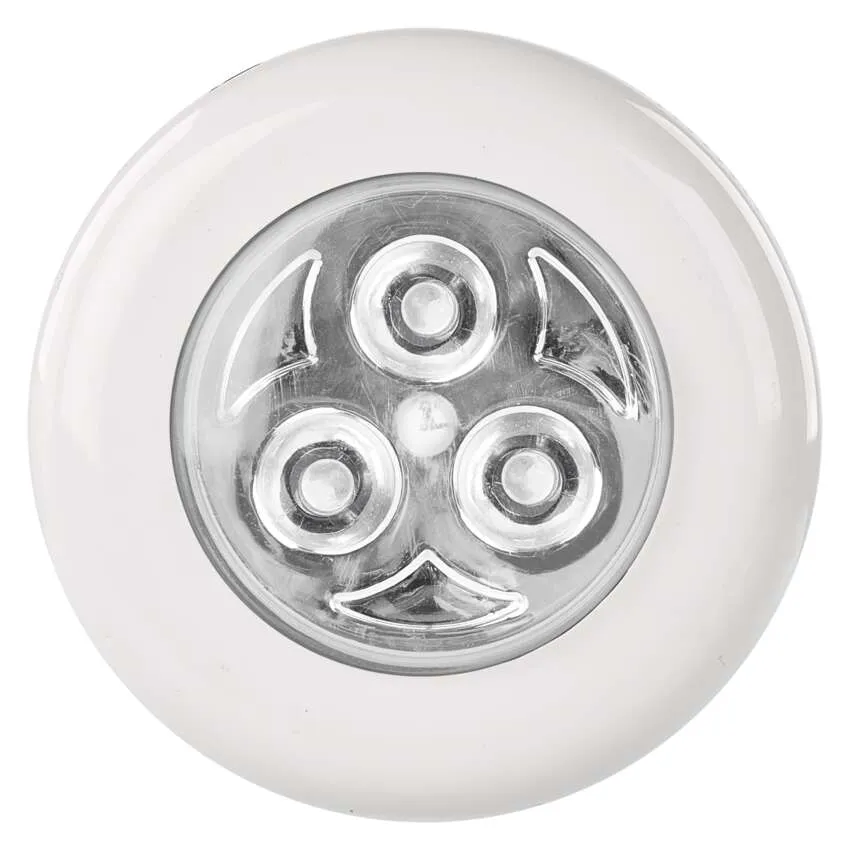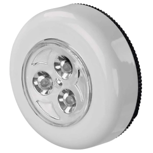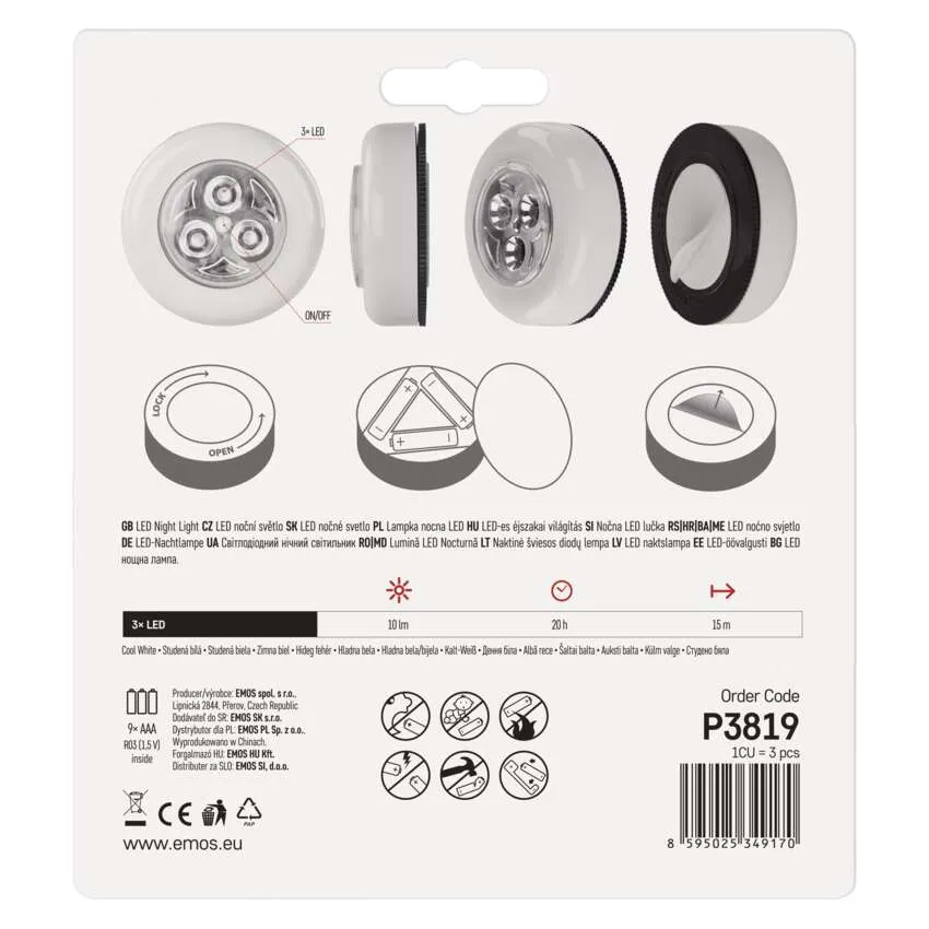 Lampka LED marki EMOS, model P3819 — zasilana trzema bateriami AAA, wyposażona w 3 diody LED, strumień świetlny ok. 10 lm, wyposażona w tylną część samoprzylepną umożliwiającą montaż w wybranym miejscu.