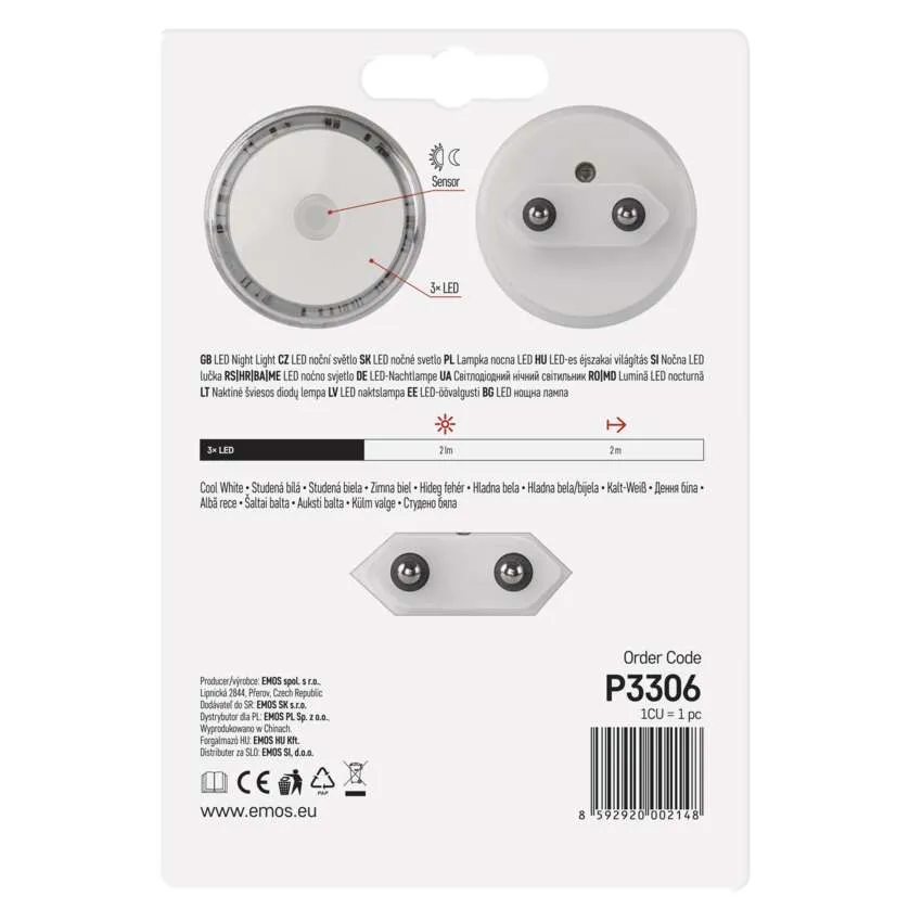 Lampka nocna marki EMOS, model P3306 – wtykowa konstrukcja na standardowe gniazdko 230 V, 3 diody LED, zużycie mocy maks. 0,5 W. Odznacza się czujnikiem zmierzchu, który włącza światło automatycznie po zapadnięciu zmroku i wyłącza, gdy natężenie światła przekroczy ok. 70 lux. Dzięki kompaktowym wymiarom (~50 × 70 mm) i niewielkiej mocy doskonale sprawdzi się jako dyskretne oświetlenie nocne czy orientacyjne.