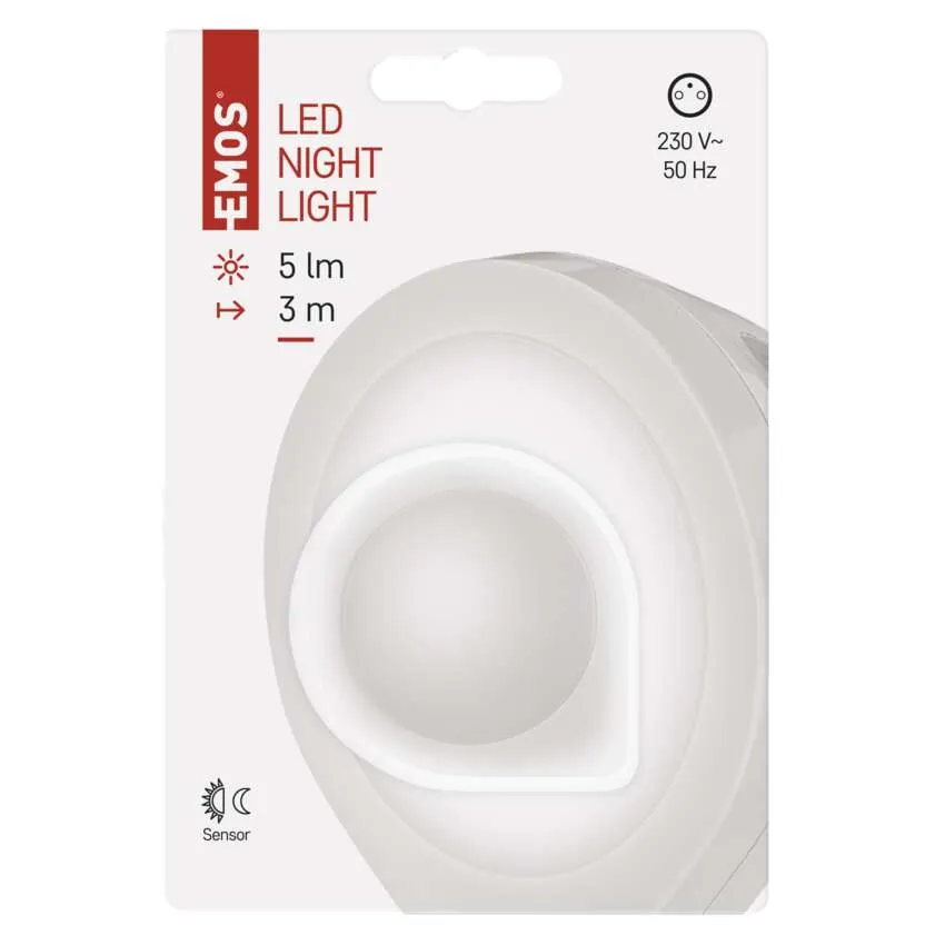 Delikatna i funkcjonalna lampka nocna marki EMOS (model P3314) przeznaczona do podłączenia bezpośrednio do gniazdka 230 V. Wyposażona w czujnik zmierzchu — automatycznie włącza się po zapadnięciu ciemności i wyłącza się, gdy warunki świetlne się poprawią.