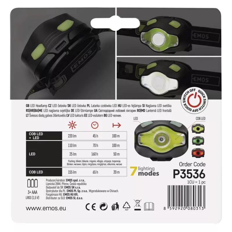 EMOS P3536 – Latarka czołowa LED COB 3W + LED 3W