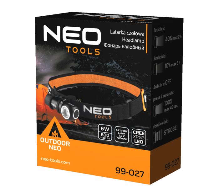 Wydajna i praktyczna latarka czołowa marki NEO TOOLS, model 99-027, wyposażona w diodę CREE XPG3 LED, gwarantującą mocne i jasne światło przy niskim zużyciu energii. Zasilana wbudowanym akumulatorem ładowanym przez USB, zapewnia wygodę i niezawodność w każdych warunkach. Lekka, kompaktowa i komfortowa w użytkowaniu – idealna do pracy i aktywności outdoorowych.
