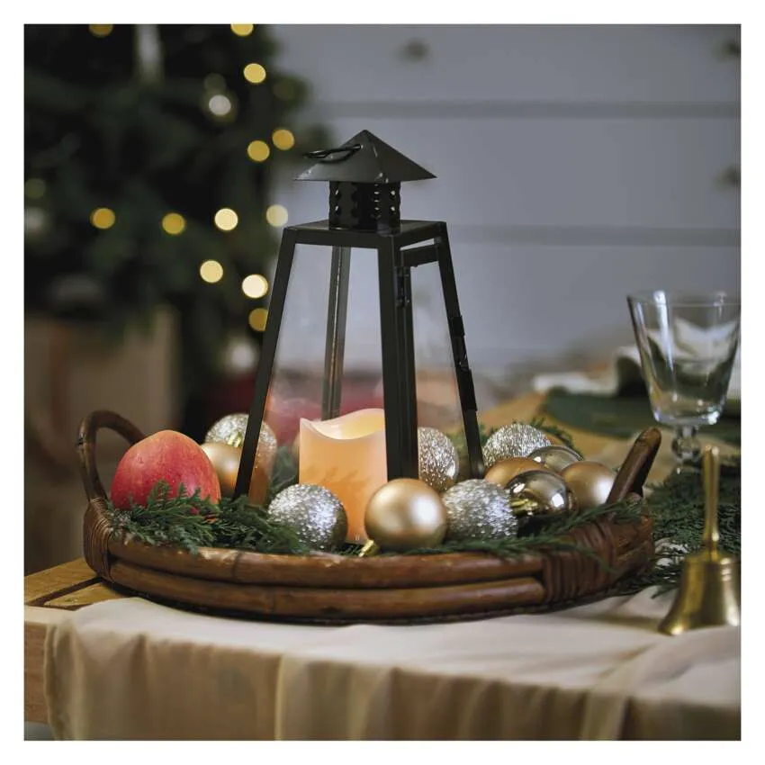 Stylowa latarnia LED w czarnej obudowie o wymiarach 26,5 cm, zasilana 3× bateriami AAA. Emituje ciepłe, przytulne światło w stylu vintage. Idealna do dekoracji wnętrz, bezpieczna, energooszczędna i łatwa w użyciu.