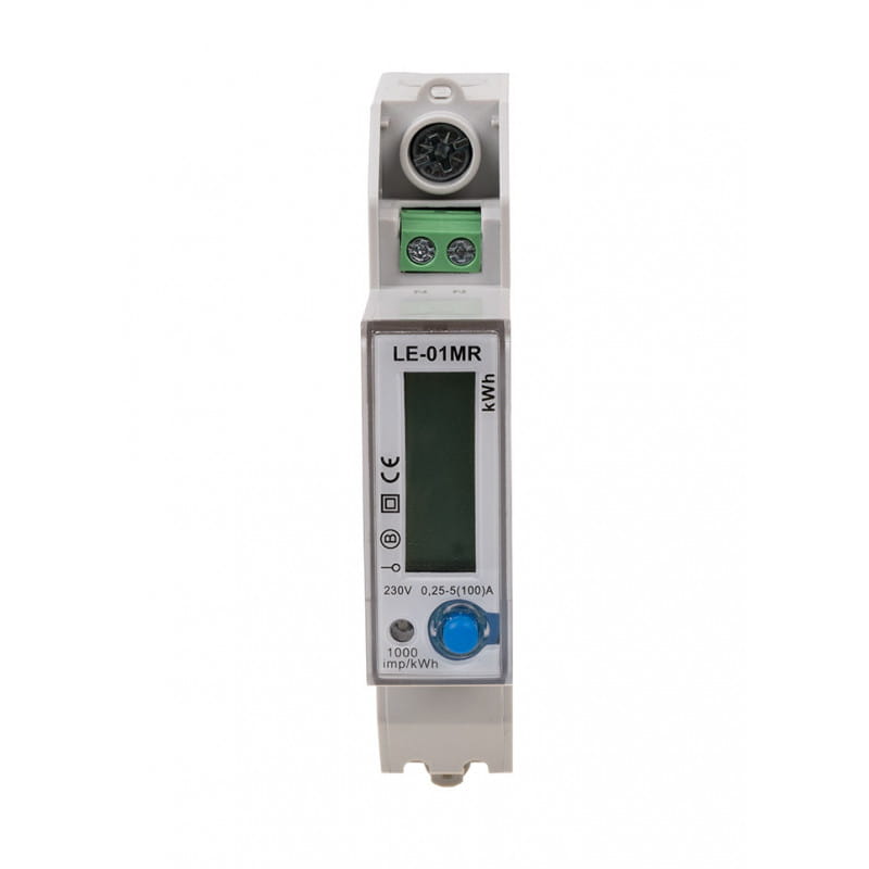 Jednofazowy licznik LE-01MR pod wpływem przepływającego prądu i przyłożonego napięcia dokonuje precyzyjnego pomiaru ilości pobieranej energii elektrycznej. Pobór energii sygnalizowany jest przez miganie diody LED (1000 i/kWh). Dodatkowo licznik dokonuje pomiaru parametrów sieci zasilającej oraz temperatury własnej układu. Wartości wskazywane są cyklicznie na wyświetlaczu LCD. Zmiana parametru następuje domyślnie co 5 sekund lub z ustawioną częstotliwością przez użytkownika oraz ręcznie za pomocą przycisku na czole licznika. Wyświetlacz jest aktywny przy załączonym zasilaniu wskaźnika. Licznik w sieci komunikacyjnej pracujący jako urządzenie typu Slave . Komunikacja odbywa się zgodnie ze standardem Modbus RTU przez port szeregowy RS-485. Odczytane wartości rejestrów po przeliczeniu dają wyniki zgodne ze wskazaniami na wyświetlaczu wskaźnika. Każdy z liczników identyfikowany jest przez unikalny adres nadawany przez użytkownika.