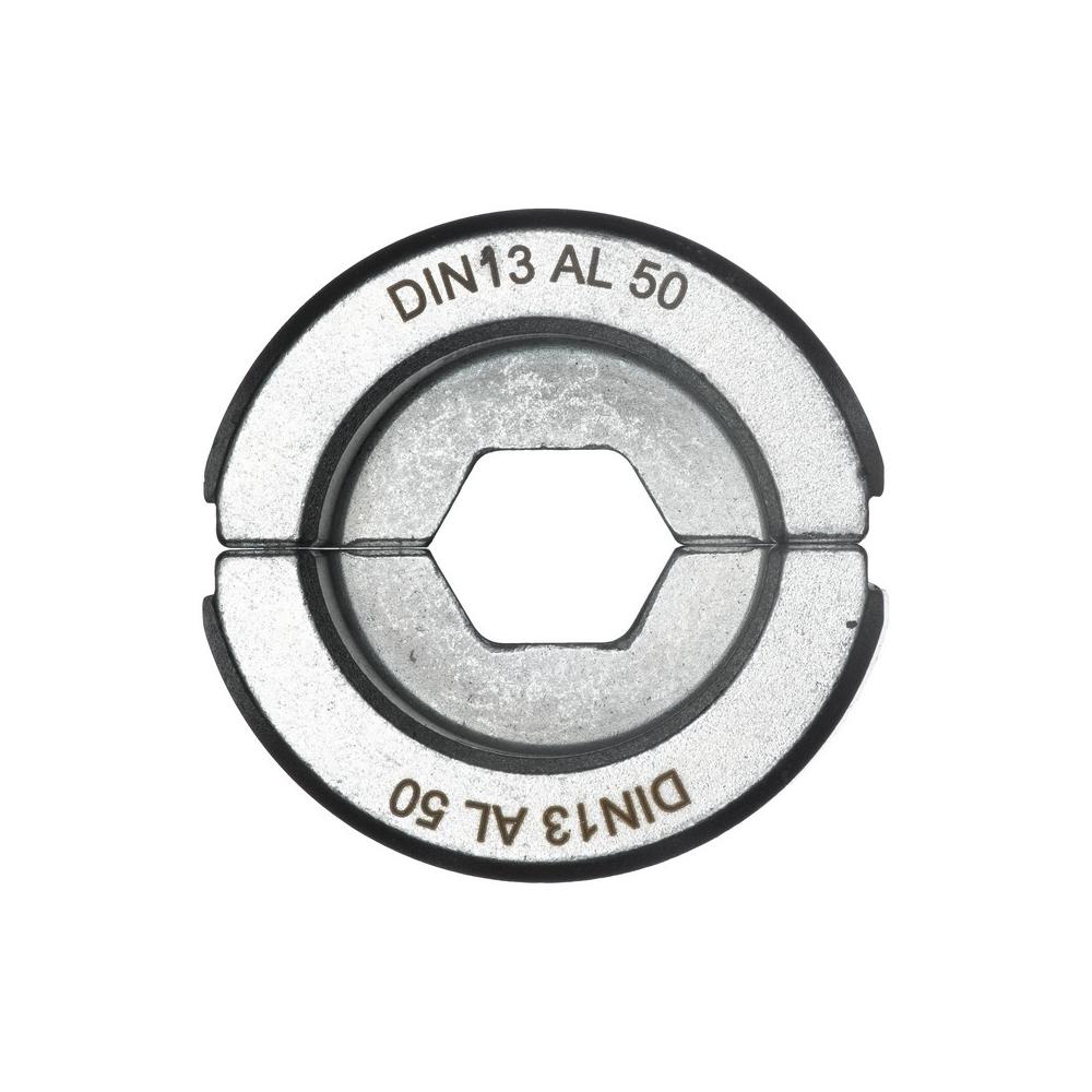 Milwaukee 4932459508 to matryca zaciskowa typu DIN13 AL 50, przeznaczona do akumulatorowej praski hydraulicznej M18™ FORCE LOGIC™ HCCT109/42. Umożliwia precyzyjne zaciskanie aluminiowych końcówek kablowych oraz konektorów o przekroju 50 mm², zgodnych z normami: