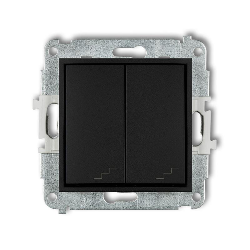 Mechanizm łącznika podwójnego schodowego 12MWP-33 MINI KARLIK w kolorze czarny mat, umożliwiający sterowanie dwoma niezależnymi obwodami oświetleniowymi w układzie schodowym. Trwałe tworzywo i nowoczesny design serii MINI.