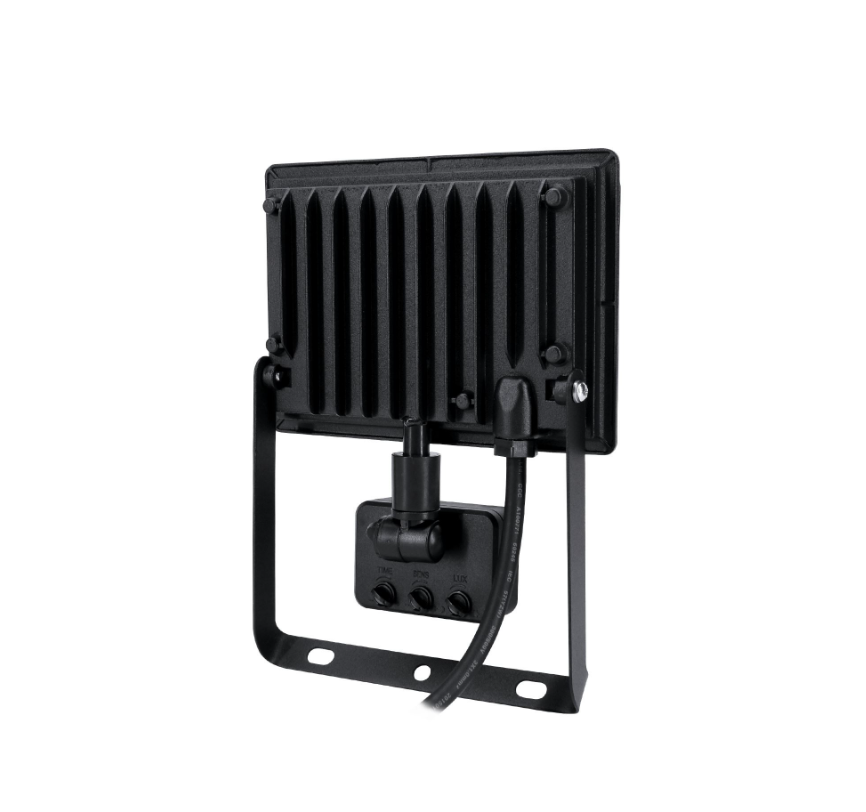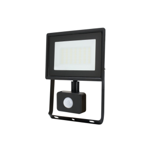 Naświetlacz zewnętrzny LED 30W z czujnikiem PIR, włączający światło przy wykryciu ruchu. Neutralna biel 4000K, strumień 2520 lm, obudowa IP65 odporna na kurz i wodę. Idealny do ogrodów, podjazdów, wejść i terenów przemysłowych. Model C64-S-LFK2-030BL-4K, kolor czarny.