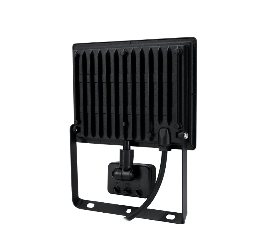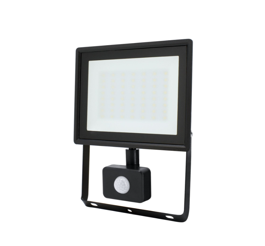 Naświetlacz zewnętrzny LED 50W z czujnikiem PIR, włączający światło przy wykryciu ruchu. Chłodna biel 6500K, strumień 4320 lm, obudowa IP65 odporna na kurz i wodę. Idealny do ogrodów, podjazdów, wejść i terenów przemysłowych. Model C64-S-LFK2-050BL-6K, kolor czarny.