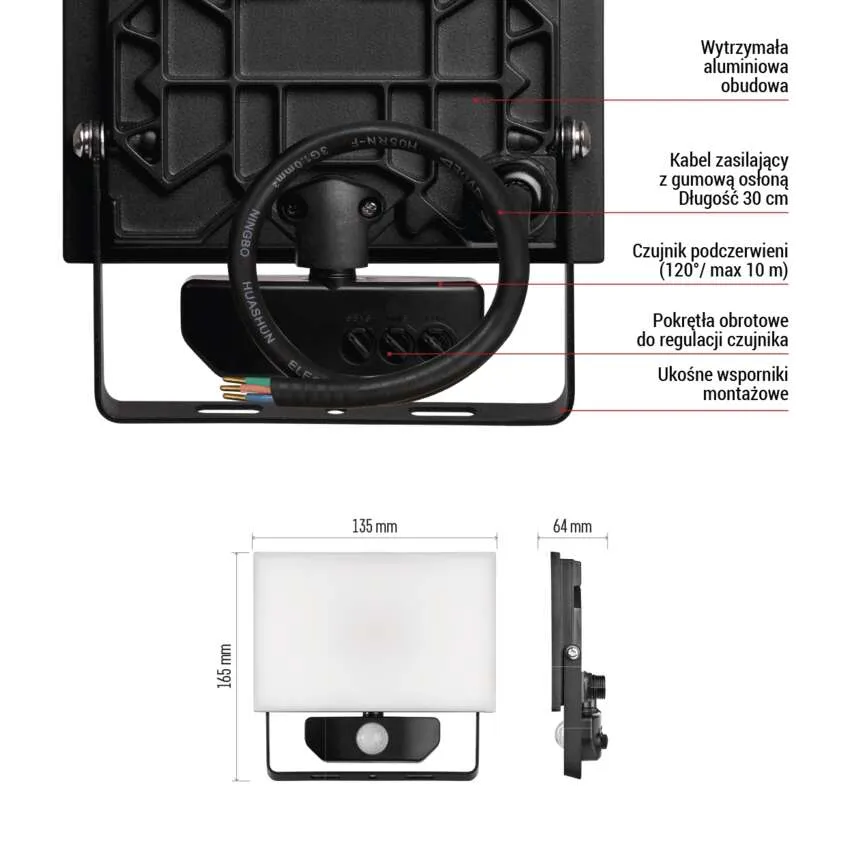 Reflektor LED 20 W z czujnikiem ruchu PIR, 2000 lm, neutralna biel 4000 K. Solidna aluminiowa obudowa, IP54, kąt świecenia 120°. Idealny do oświetlenia podjazdu, wejścia i elewacji. Automatyczne włączanie po wykryciu ruchu, żywotność ok. 25 000 h.