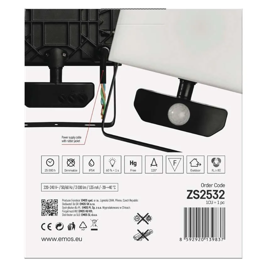 Naświetlacz LED TAMBO z czujnikiem PIR, 30 W, 3000 lm, czarny ZS2932 EMOS