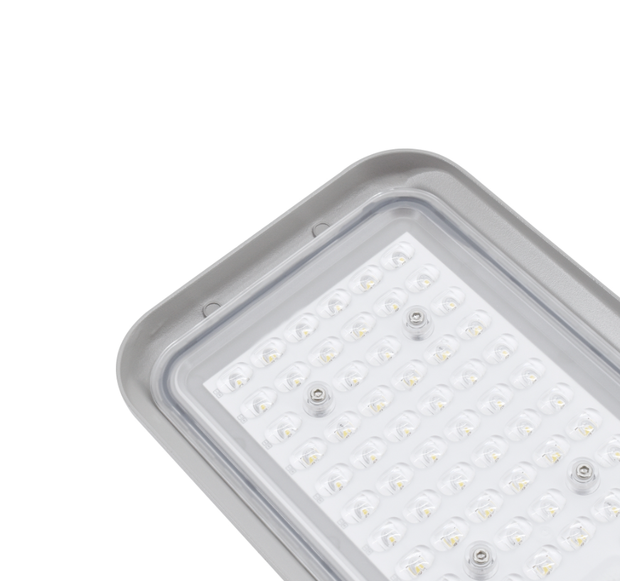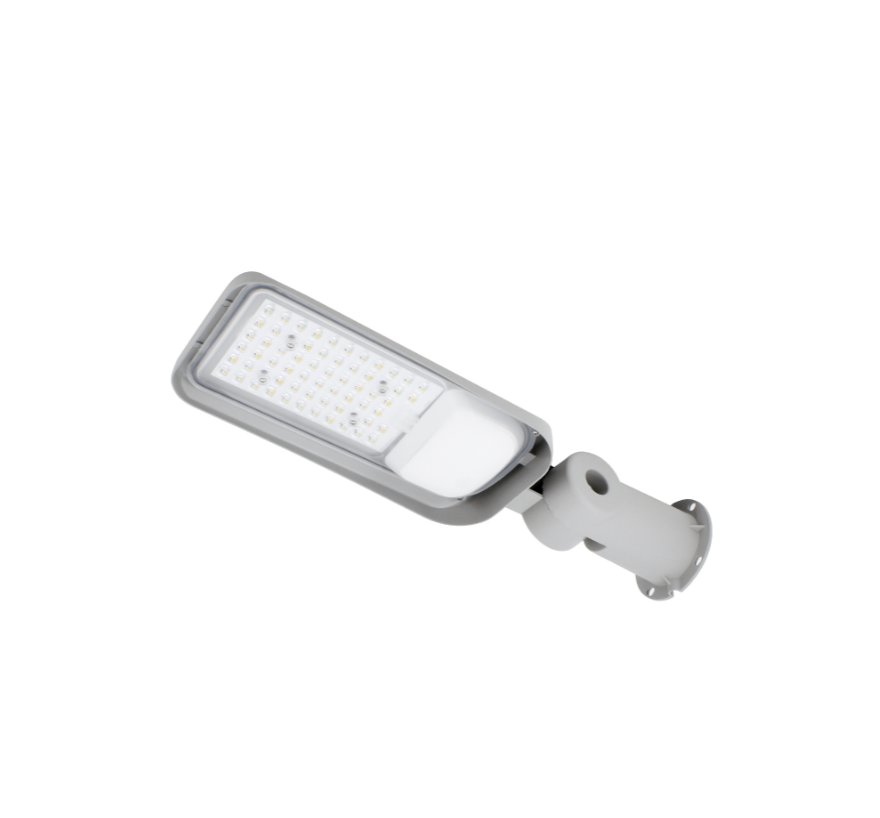 Energooszczędna oprawa uliczna LED 50W o strumieniu 6750 lm i neutralnej barwie 4000K. Obudowa IP65 chroni przed kurzem i wodą, idealna do ulic, chodników, parkingów i terenów przemysłowych. Model C82-JAZ-050LG-4K, kolor jasnoszary.