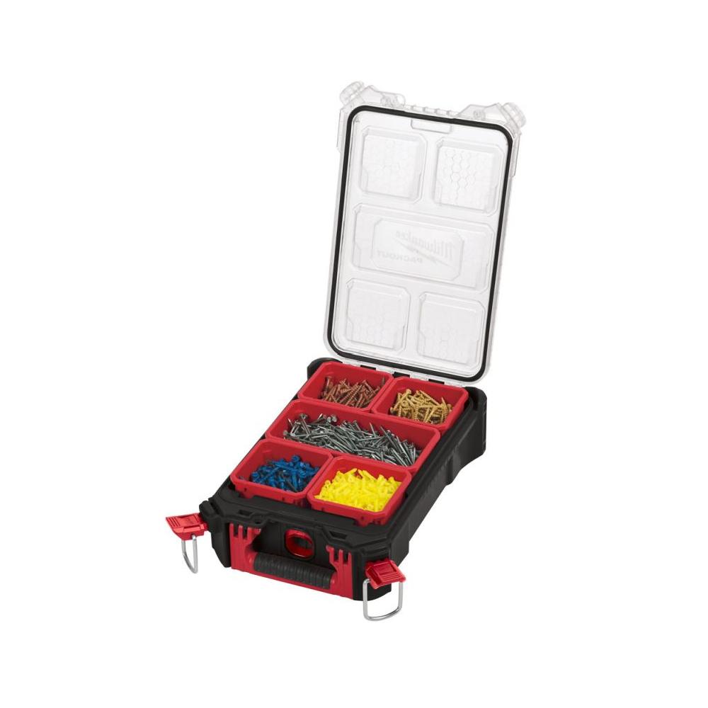 Organizer PACKOUT Średni o numerze katalogowym 4932464083 to element modułowego systemu przechowywania narzędzi Milwaukee PACKOUT™. Wykonany z odpornych na uderzenia polimerów, zapewnia trwałość i ochronę w trudnych warunkach pracy.