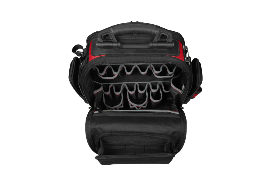 Wielokomorowe wnętrze – liczne kieszenie i przegrody umożliwiają uporządkowane przechowywanie narzędzi, akcesoriów i drobnych części.