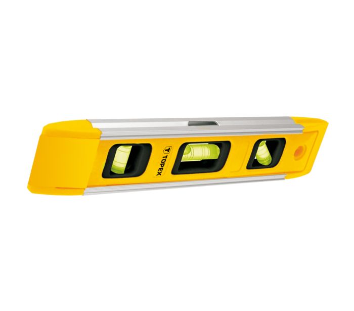 TOPEX 29C894 – poziomnica Torpedo 230 mm, 3 libelle (0°, 45°, 90°), magnes, rowkowana podstawa. Lekka i uniwersalna.