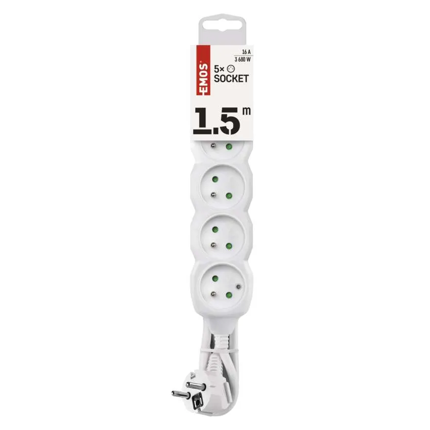 Przedłużacz EMOS P0511 o długości 1,5 m z 5 gniazdami i uziemieniem. Przewód 1 mm² z izolacją PVC, maksymalne obciążenie 3680 W, przeznaczony do użytku wewnętrznego (IP20), kolor biały.
