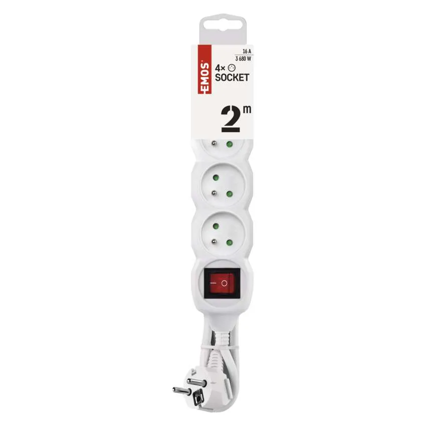 Przedłużacz EMOS P1412 o długości 2 m z 4 gniazdami i wyłącznikiem. Przewód 1 mm² z izolacją PVC, maksymalne obciążenie 3680 W, przeznaczony do użytku wewnętrznego (IP20), kolor biały.