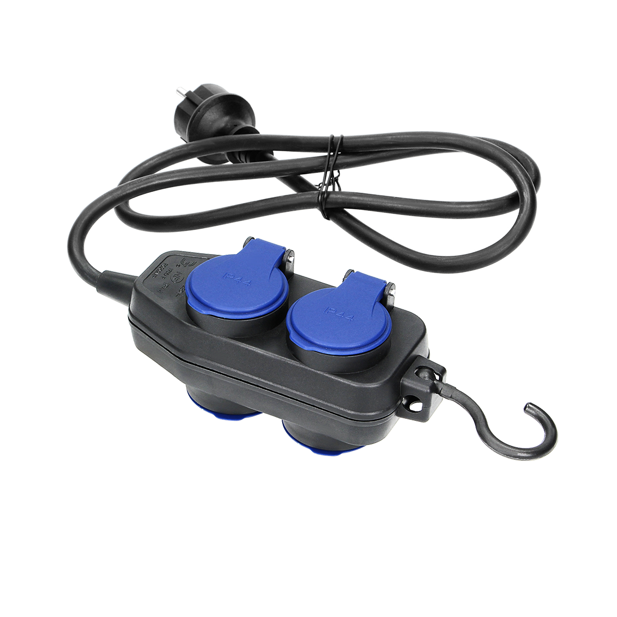 Przedłużacz warsztatowy, bryzgoszczelny bez wyłącznika z kablem w izolacji gumowej. Posiada 4 gniazda (2+2) sieciowe z uziemieniem i przesłonami torów prądowych oraz pokrywami uszczelniającymi, które chronią przed zabrudzeniami i wilgocią. Hak, który ułatwia montaż na stanowisku pracy.