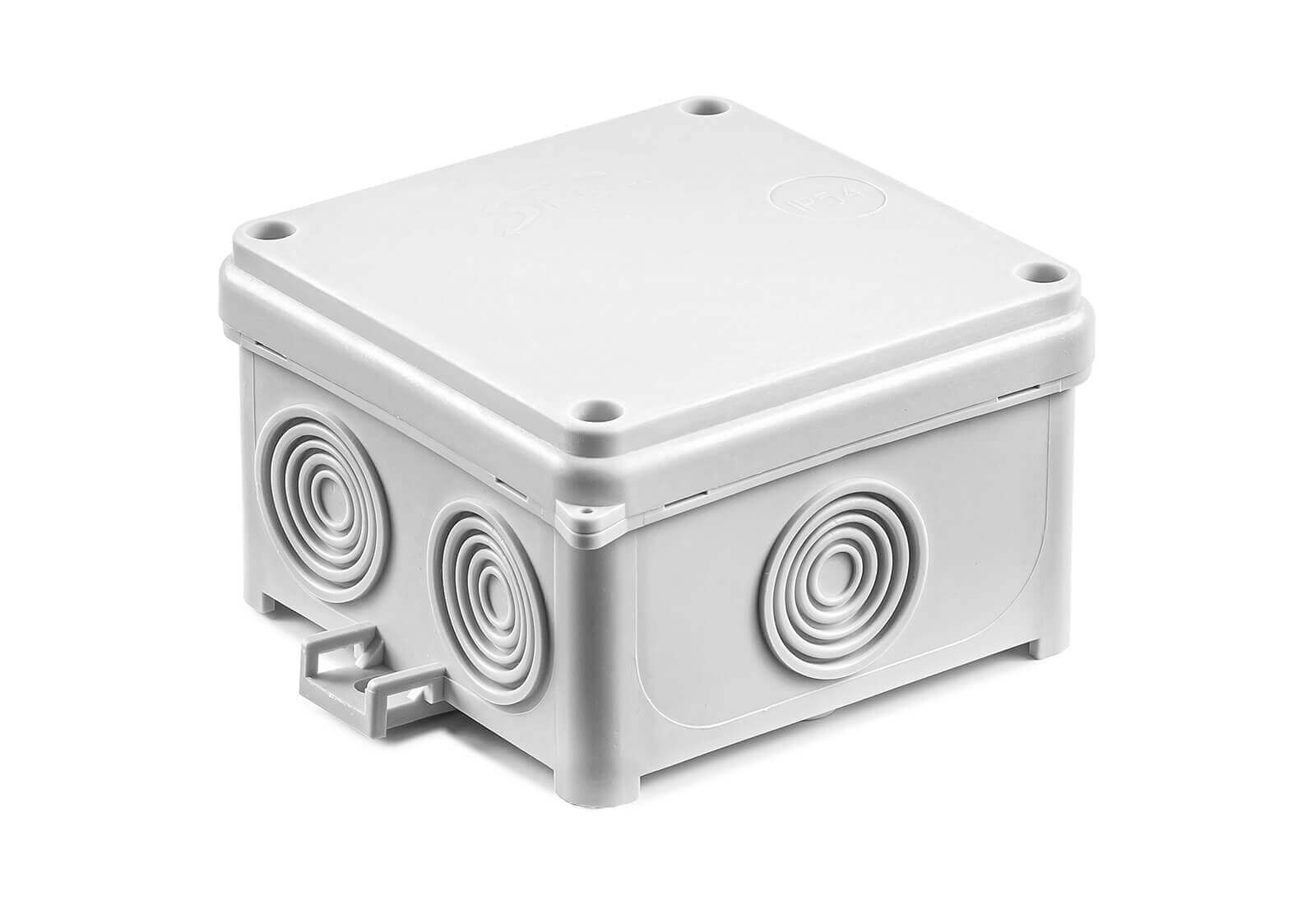 Puszka naścienna 88×88×55 mm, IP54, z zintegrowanymi dławnicami. Chroni urządzenia elektryczne przed kurzem i wodą, umożliwiając szybki montaż przewodów.