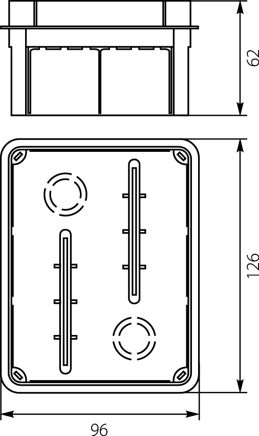 Model o wymiarach 96×126×60,5 mm wyposażony jest w białą pokrywę oraz zaślepkę tekturową, chroniącą wnętrze puszki przed zabrudzeniami i ułatwiającą montaż. Stopień ochrony IP40 zabezpiecza przed dostępem ciał stałych, co czyni puszkę odpowiednią do instalacji elektrycznych wewnętrznych.