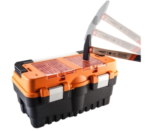 NEO TOOLS 84-105 – skrzynka narzędziowa 21″, aluminiowy uchwyt i zapięcia, organizer na pokrywie, tacka wewnętrzna, miejsce na kłódkę, pojemność 21 l.