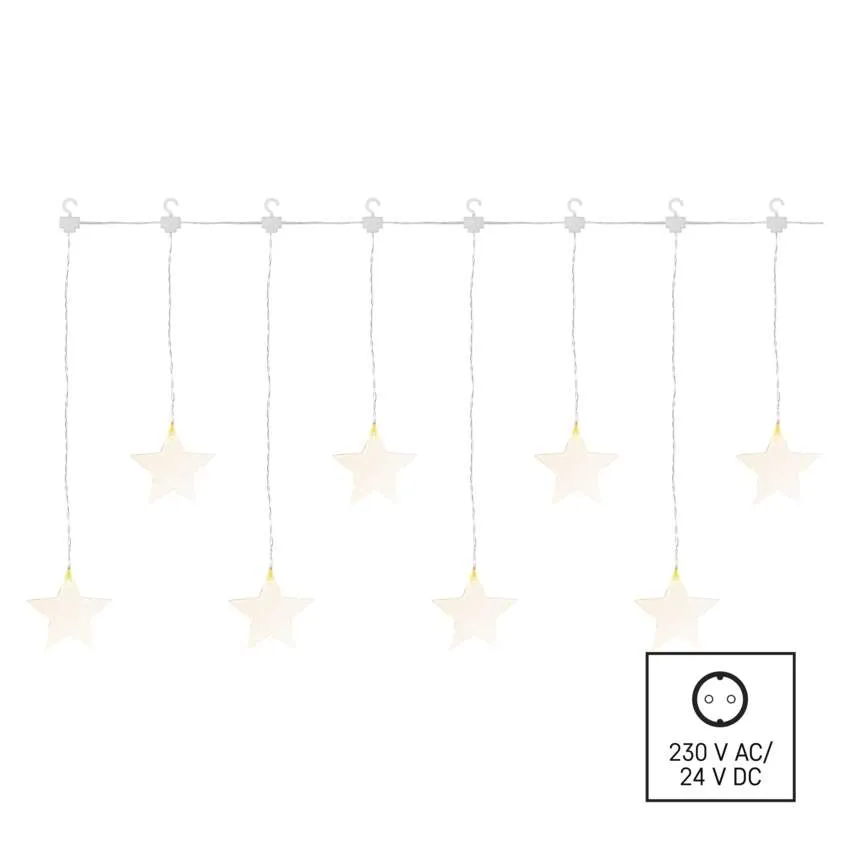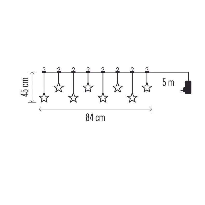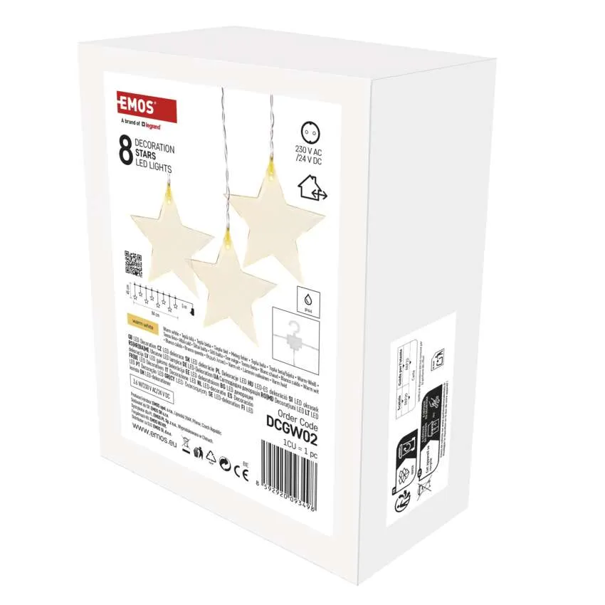 Dekoracja LED marki EMOS, model DCGW02 – 8 świetlnych gwiazdek w formie sopli o wymiarach 45 × 84 cm, świecących ciepłą białą barwą. Zasilanie 230 V AC, stopień ochrony IP44 umożliwia użycie wewnątrz i na zewnątrz. Długość przewodu to 5 metrów. Całość zużywa jedynie 3,6 W. Idealna ozdoba na święta — okna, ściany czy tarasy.