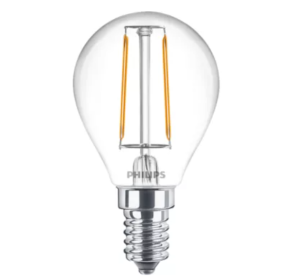 Stylowa żarówka LED marki Philips w klasycznym, przezroczystym kształcie P45, przeznaczona do gwintu E14 — doskonała jako energooszczędny zamiennik tradycyjnej żarówki o mocy ~25 W.