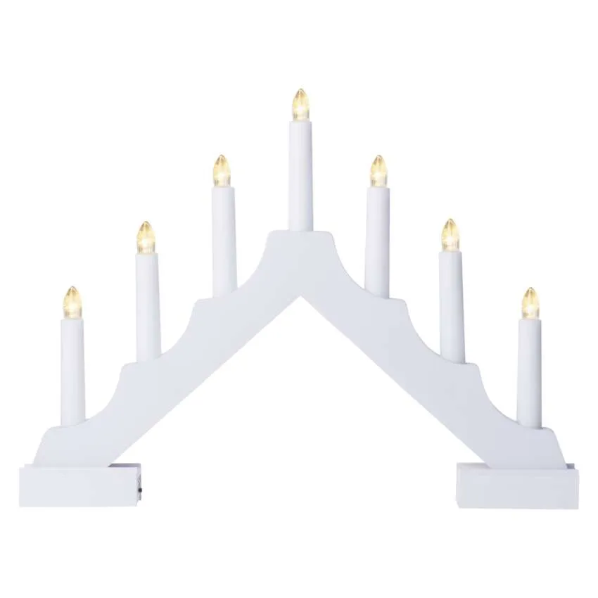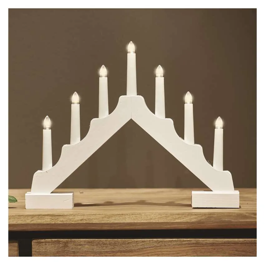 Świąteczny świecznik LED od EMOS, model DCAW12 – wykonany z drewna, w białym kolorze, o wysokości ok. 29 cm (wymiary 35 × 29 cm). Wyposażony w 7 energooszczędnych diod LED, które emitują ciepłe, przytulne światło. Zasilany dwiema bateriami AA. Świecznik posiada timer – świeci przez 6 godzin, po czym automatycznie gaśnie na 18 godzin. Przeznaczony do użytku wewnętrznego (IP20).