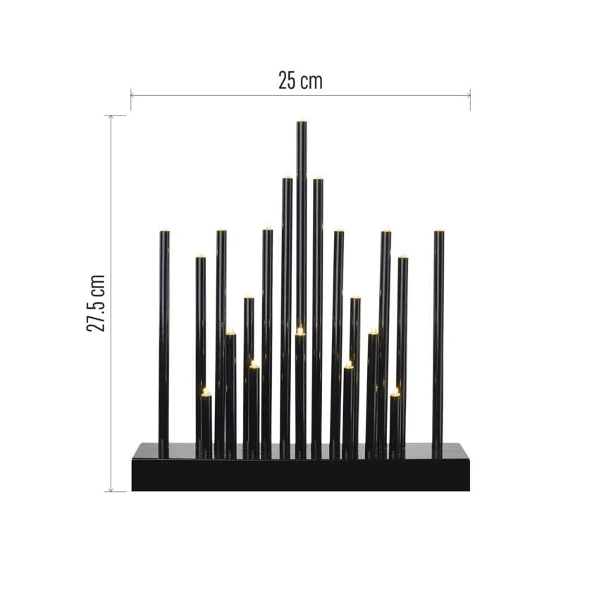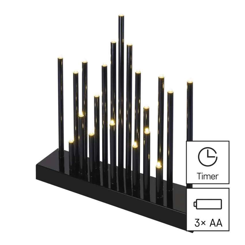 Elegancki czarny świecznik LED z 20 diodami emitującymi ciepłe światło. Zasilany 3× bateriami AA, wyposażony w timer 6 h ON / 18 h OFF. Idealny do dekoracji wnętrz, bezpieczny, energooszczędny i łatwy w użyciu.