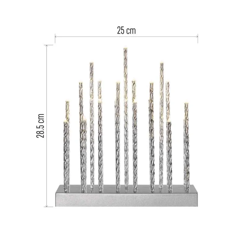 Elegancki srebrny świecznik LED z 19 diodami emitującymi ciepłe światło. Zasilany 3× bateriami AA, wyposażony w timer 6 h ON / 18 h OFF. Idealny do dekoracji wnętrz, bezpieczny, energooszczędny i łatwy w użyciu.
