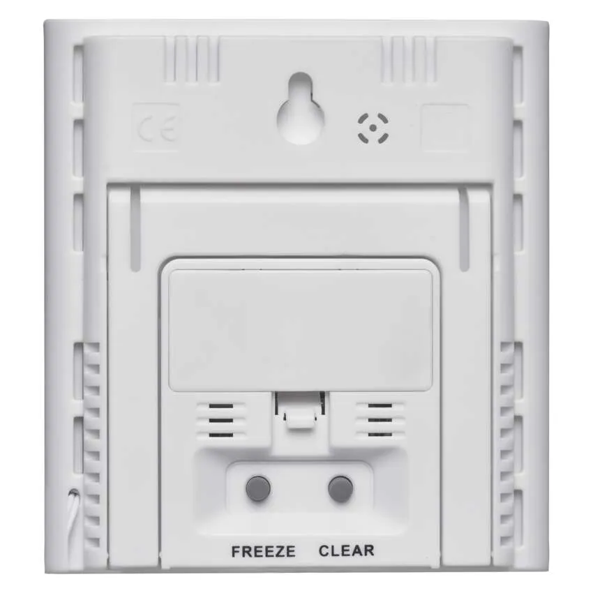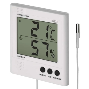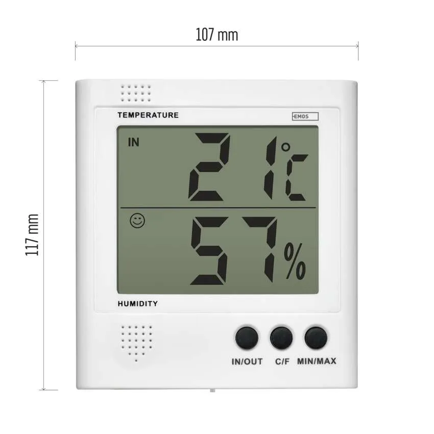 Termometr cyfrowy EMOS RS8471 z sondą zewnętrzną. Mierzy temperaturę wewnętrzną i zewnętrzną oraz wilgotność. Posiada funkcję MIN/MAX, alarm gołoledzi i czytelny wyświetlacz. Idealny do domu, biura i na zewnątrz.