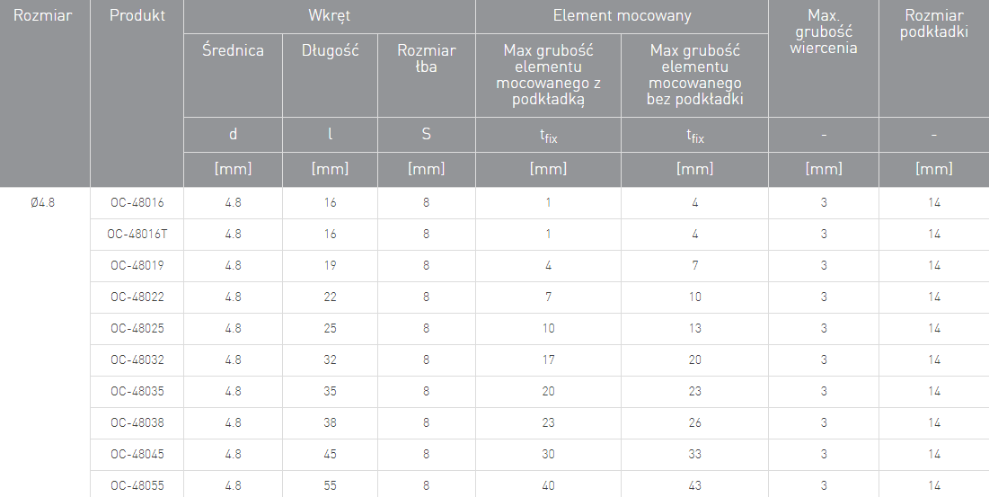 - Gwint utwardzony powierzchniowo (trzpień zachowuje elastyczność). Zabezpieczony przed korozją warstwą ocynku o grubości nie mniejszej niż 12 um. Kształt gwintu oraz jego wysokość jest ściśle powiązany z przeznaczeniem łącznika samowiercącego mocowania blach profilowanych do konstrukcji stalowej.
