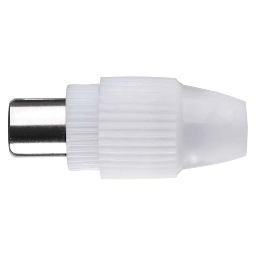 Biała wtyczka prosta IEC EMOS K1331 do przewodów koncentrycznych (antenowych). Trwała plastikowa obudowa, łatwy montaż. Idealna do instalacji i serwisu sprzętu RTV.