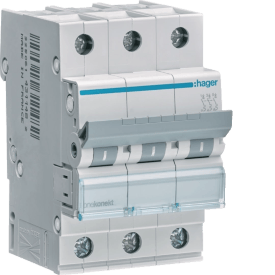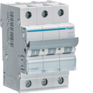 Wyłącznik nadprądowy Hager MCN320E to trójfazowe zabezpieczenie typu MCB o charakterystyce wyzwalania C, przeznaczone do ochrony obwodów przed przeciążeniami i zwarciami.
