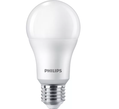 Nowoczesna żarówka LED marki Philips w kształcie A60 z gwintem E27, stanowiąca energooszczędny zamiennik tradycyjnej żarówki 100 W. Oferuje jasny strumień świetlny (~1521 lm) przy bardzo niskim zużyciu energii (~10-13 W) i ciepłej barwie światła 2700 K. Idealna do mieszkań, domów i pomieszczeń użytkowych.