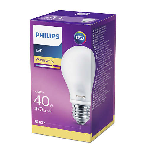Żarówka LEDClassic 4,5W (40W) A60 E27 WW FR 470lm 2700K Philips pasuje do istniejących opraw z trzonkiem E27. Można ją stosować jako zamiennik tradycyjnej żarówki o mocy 40 W. Emituje ona światło o temperaturze barwowej 2700K, co pozwala stworzyć ciepły, spokojny nastrój, źródła światła idealnie pasują do zastosowania w kuchniach, jadalniach i salonach. Technologia LED umożliwia zaoszczędzenie nawet 80% energii w stosunku do standardowych żarówek. Zakup zwróci się w krótkim czasie i pozwoli oszczędzać pieniądze przez kolejne lata. Żarówka LEDClassic 4,5W (40W) A60 E27 WW FR idealnie zaspokoi podstawowe potrzeby oświetleniowe, zapewniając piękne światło i niezawodną pracę nawet przez 15000h. Opisywana żarówka firmy Philips nie emituje promieniowania ultrafioletowego ani podczerwonego.
