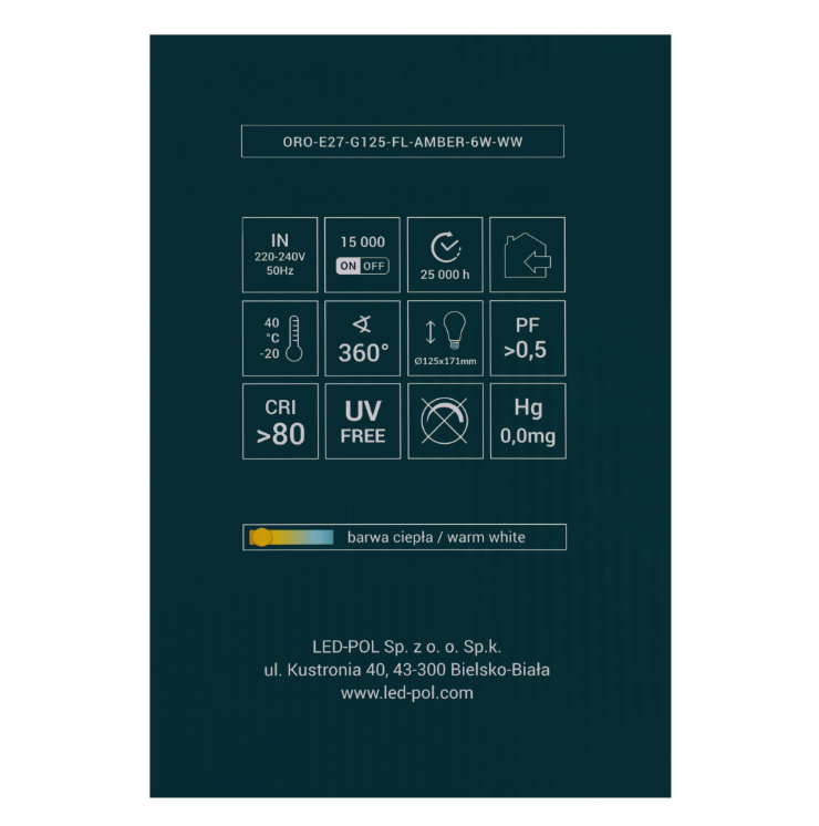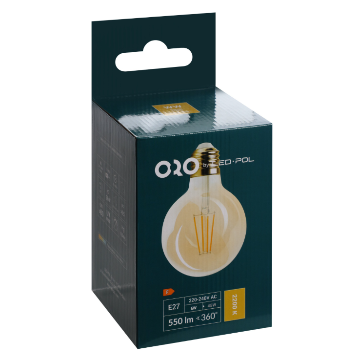 Żarówka ORO AMBER E27 G125 6W WW ORO04029 LED-POL łączy elegancki, dekoracyjny wygląd, energooszczędność i przyjemne, ciepłe światło, które tworzy wyjątkowy klimat w każdym wnętrzu.